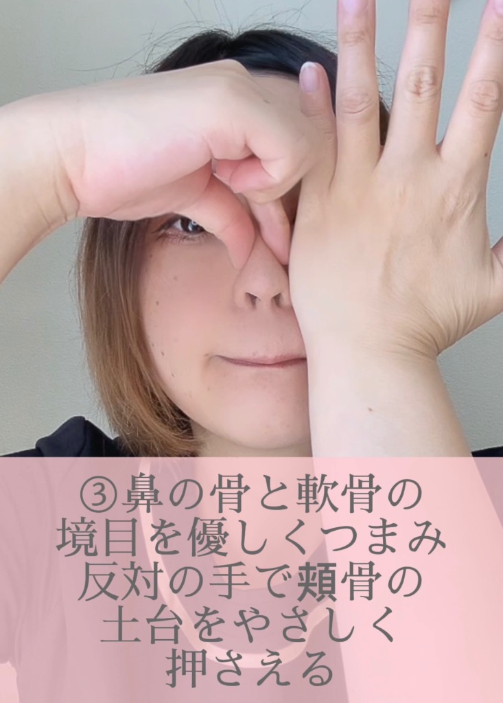 ③鼻の骨と軟骨の境目を優しくつまみ反対の手で頬骨の土台をやさしく押さえる