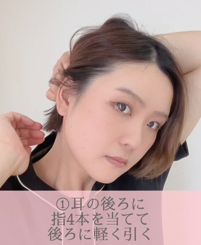 ①耳の後ろに指4本を当てて後ろに引く
